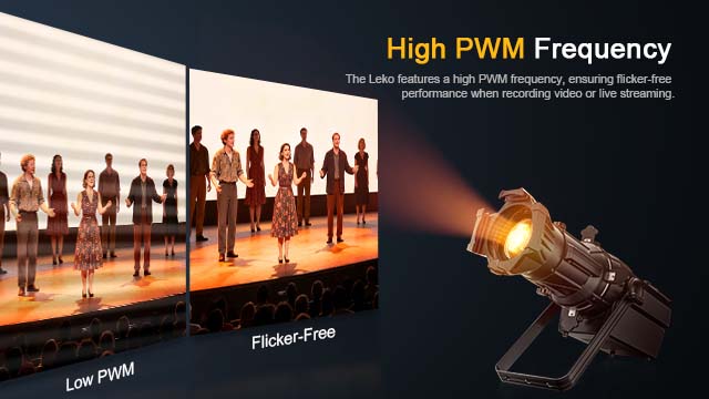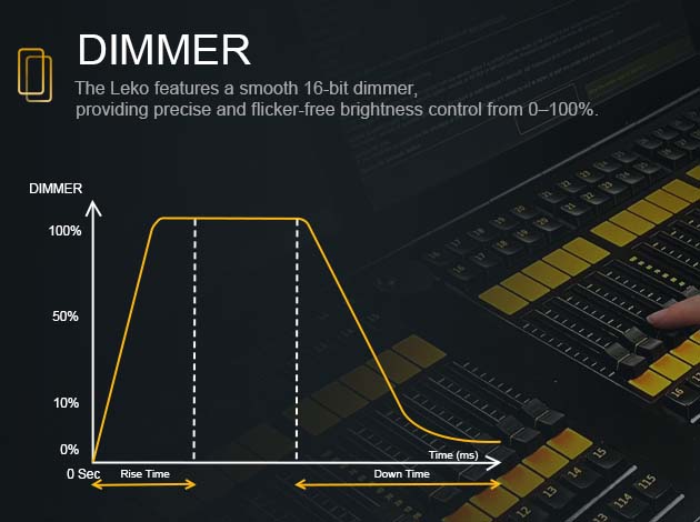 The Leko features a smooth 16-bit dimmer, providing precise and flicker-free brightness control from 0–100%.