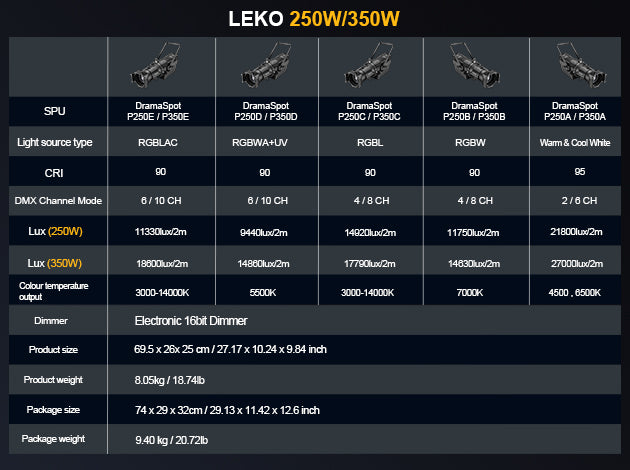 The Leko250W/350W color system blends red, green, blue, lime, amber, and cyan to deliver an