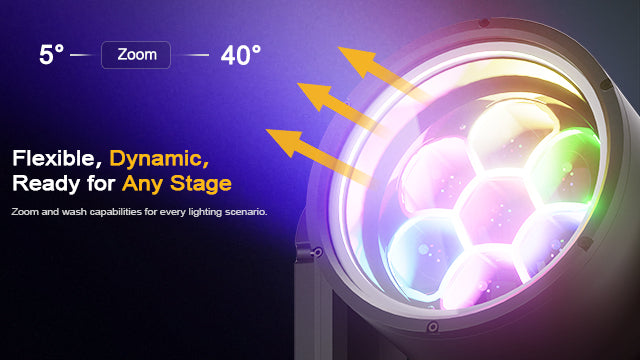 The 5°–40° motorized zoom delivers everything from razor-sharp beams to wide, even washes, seamlessly adapting to any atmosphere or stage design.