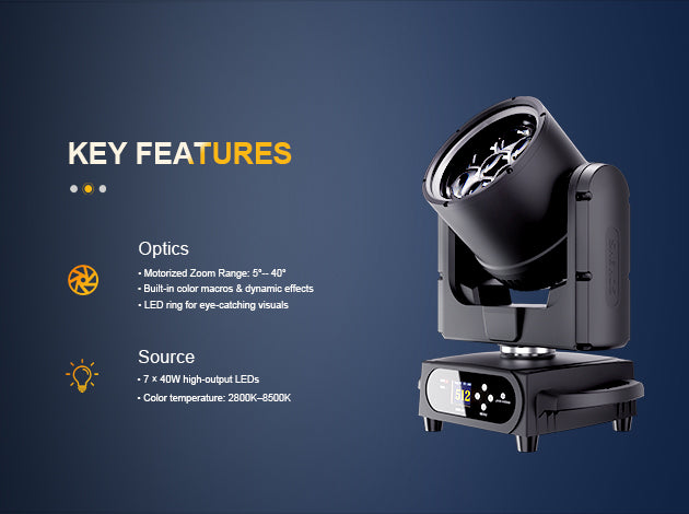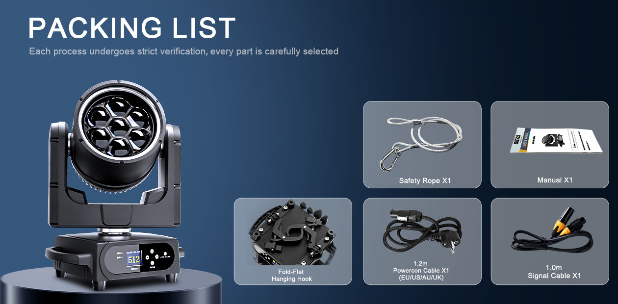 7x40W beam+wash zoom light delivers powerful, dynamic lighting effects, enabling more creative and expressive stage designs for any live performance.