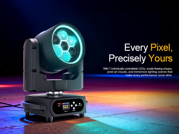 With 7 individually controllable LEDs, create flowing chases, pixel art visuals, and immersive lighting scenes that make every performance come alive.